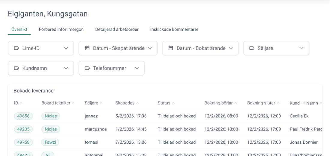 1. Översikt visar alla ordrar i systemet. Du kan söka på och filtrera efter Lime-ID, Datum, Säljare, Kundnamn och telefonnummer